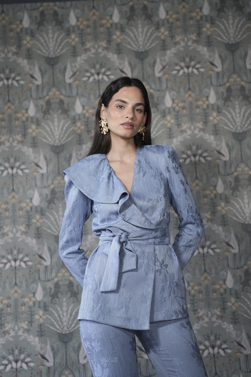 El traje Gaga es un conjunto de dos piezas confeccionado en tejido jacquard. La chaqueta ablusada con volante en el escote y lazada equilibra la figura, mientras que la hombrera añade estructura y presencia al look. El pantalón pitillo estiliza y alarga visualmente la silueta.