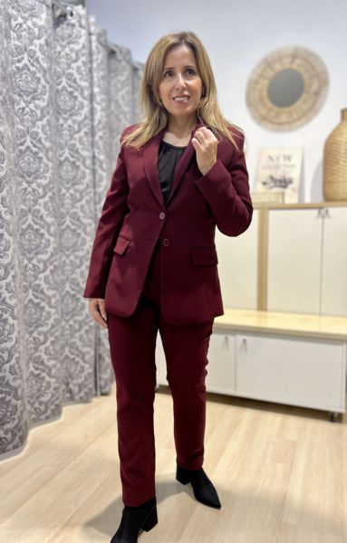 Traje de color burdeos ideal para combinar, chaqueta de corte recto y pantalón de caja alta para darte comodidad y elegante en una sola pie.