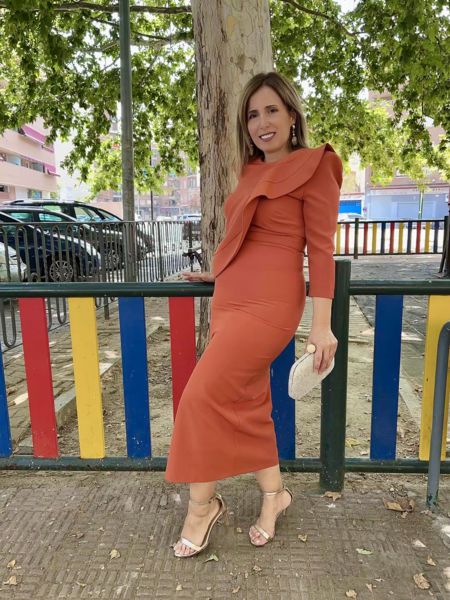 Vestido midi en color caldera de manga francesa con escote redondo con cortes en la parte delantera y con abertura lateral.Ideal para cualquier evento.