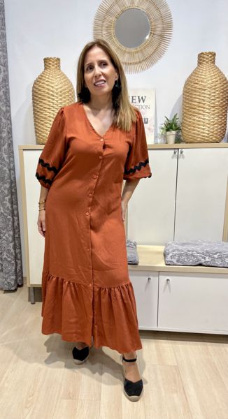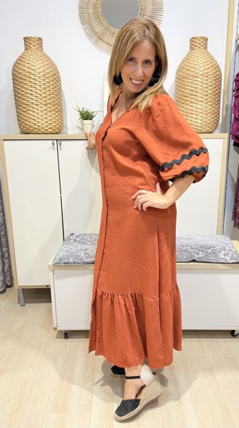 Vestido largo midi suelto abotonado,con mangas abullonadas es ideal para cualquier momento de día o de noche.