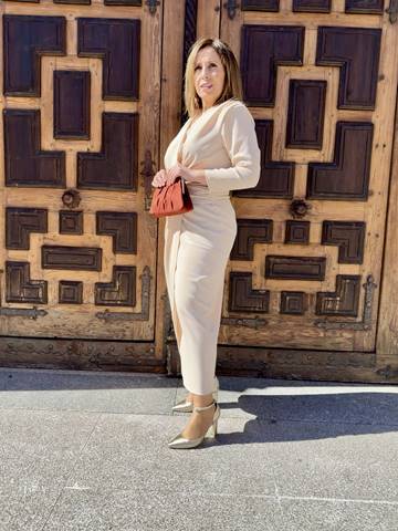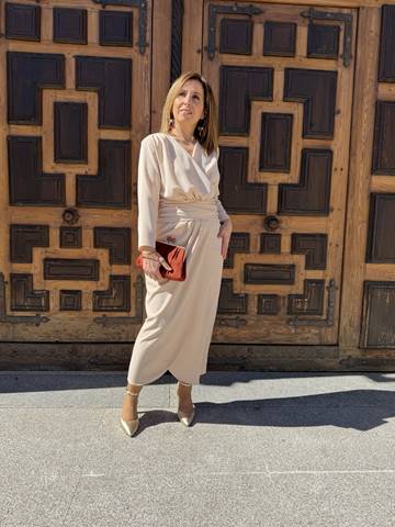 Vestido midi  en color beige con manga ,cruzado con pliegues para estilizar la figura.