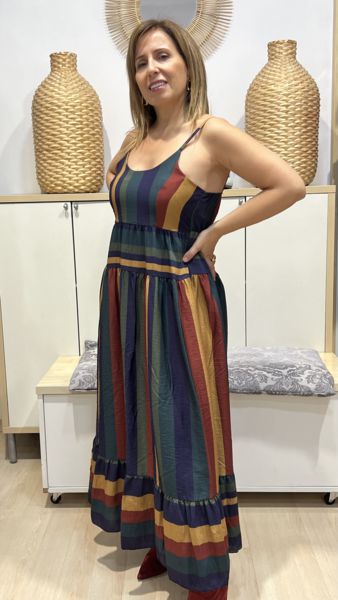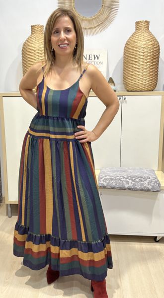 Vestido largo ,de tirantes estampado de rayas con colores de otoño ideal para combinar con botas.