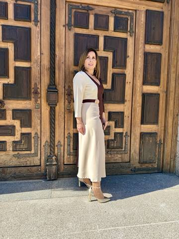 Vestido midi bicolor en tonos marrones y beige con escote en triangulo, es un modelo suelto que estiliza la figura aportando elegancia y comodidad.